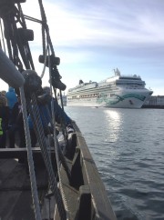 godsaker og forfriskninger som vi fikk nyte mens vi lå i le av cruiseskipene på